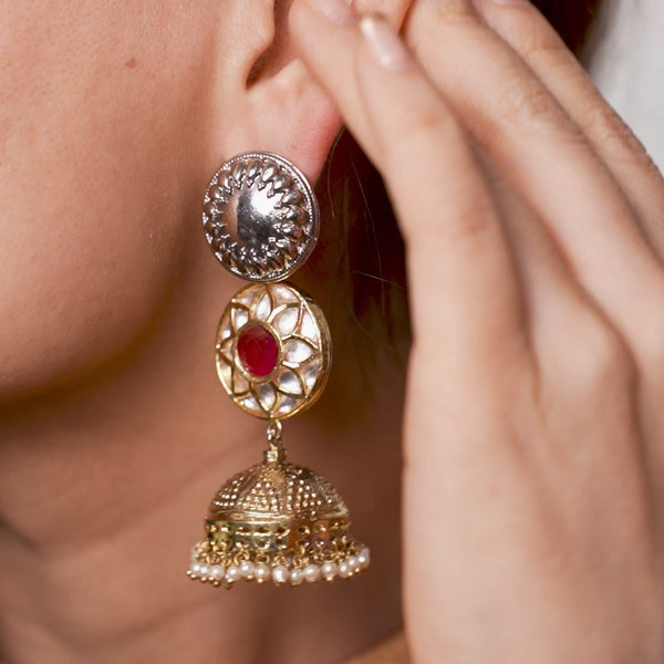 Rooted in royal tradition, these earrings feature a dual-disc design with mirror and jadau work, highlighted by a deep red stone at the center. The ornate golden jhumka base with delicate ghungroo accents completes the look, making them a perfect choice for weddings and festive occasions. A true nod to timeless Indian craftsmanship.